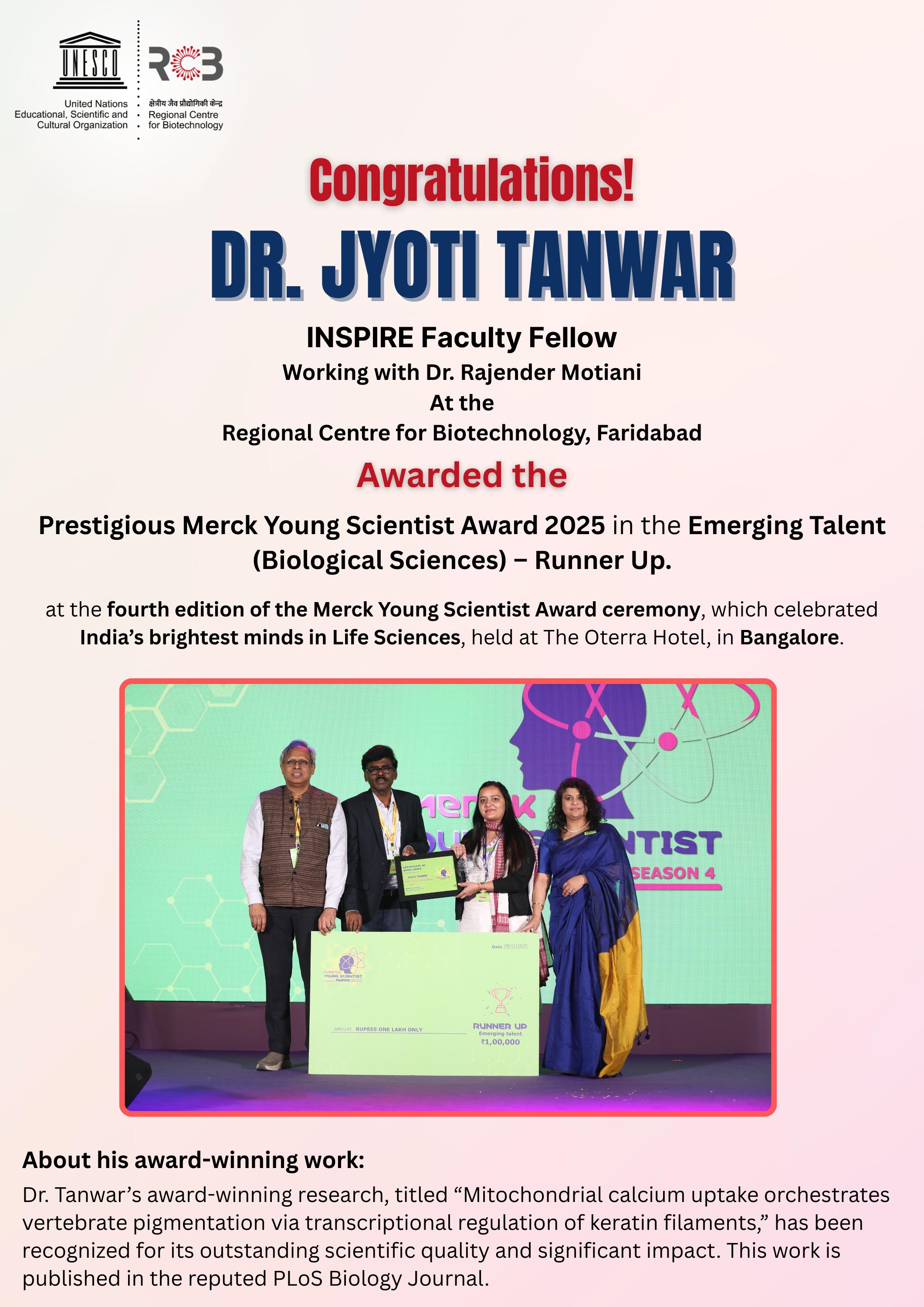 Dr. Jyoti Tanwar, INSPIRE Faculty Fellow at RCB, awarded at the Merck Young Scientist Award 2025