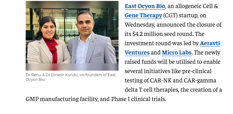 East Ocyon Bio closed $4.2 million seed round led by Aeravti Ventures and Micro Labs.